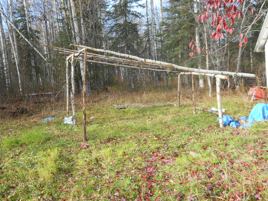 So at the end, we had three holes in the ground where the furthermost uprights would sit. We put my standard 4x4 (or 8x8 cm in metric, which is what I work in) and put my forms, used to shore up my porch) in. We aligned them by eye. Unfortunately not good enough, but it worked in the end. Slightly cockeyed, a cm in three meters.